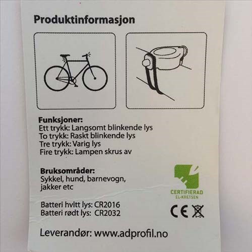 Sykkel lys med ett rødt og ett hvitt lys. Funksjoner: Ett trykk: Langsomt blinkende lys Tp trykk: Raskt blinkende lys Tre trykk: Varig lys Fire trykk: Lampen skrus av Bruksområder: Sykkel, hund, barnevogn, jakker etc.
