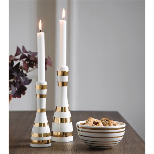 Lekker serie med håndmalte gullstriper. Settet består av 1 lysestake 20 cm, 1 lysestake 24 cm og 1 skål Ø 15 cm.