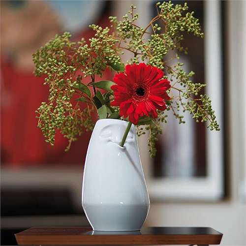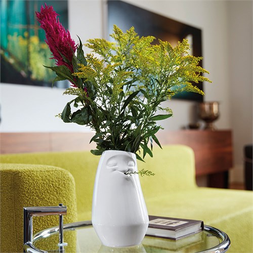 Morsom vase med et avslappet smil, som også kan være en skikkelig sjarmør med en rose i munnen. H 23 cm.