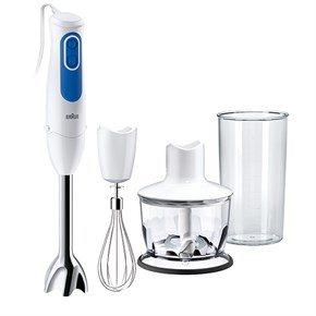 Stavmikser med metallskaft, og enkelt skifte av tilbehør. 700 W, 1 hastighet og Turbo. Visp, kutter og målebeger følger med.