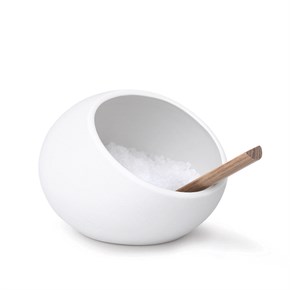 Saltkar til havsalt. Hvitt porselen med liten skje i ubehandlet eik. Ø 11 cm.
